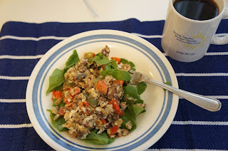 Spinach, black olives and a tablespoon of avocado. Black coffee.